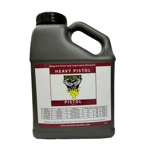 Ballistic results for the heavy pistol propellant show it appropriate for magnum pistol applications, .300 Blackout with lightweight projectiles and some other specialty ammunition. It is similar in burn speed to Accurate No 9®, and has similar application as Alliant 2400, Hodgdon H110 or Winchester 296. The superior ignition of this propellant permits less-than-full loading density. Therefore, it is not necessary to load “full power” loads with this propellant in order to achieve safe results. Shooters World tests this propellant with standard pistol primers, as well as magnum pistol primers. To date, we have found no evidence that Heavy Pistol requires a magnum primer for reliable ignition. In comparison to other magnum pistol propellants, we find Heavy Pistol exceptionally clean, accurate with either cast or jacketed projectiles, and exhibiting low muzzle flash. A spherical propellant, it meters through charge plates consistently and will flow well in a high-speed loader. This propellant is a canister form of Lovex D037.2 reloading propellant