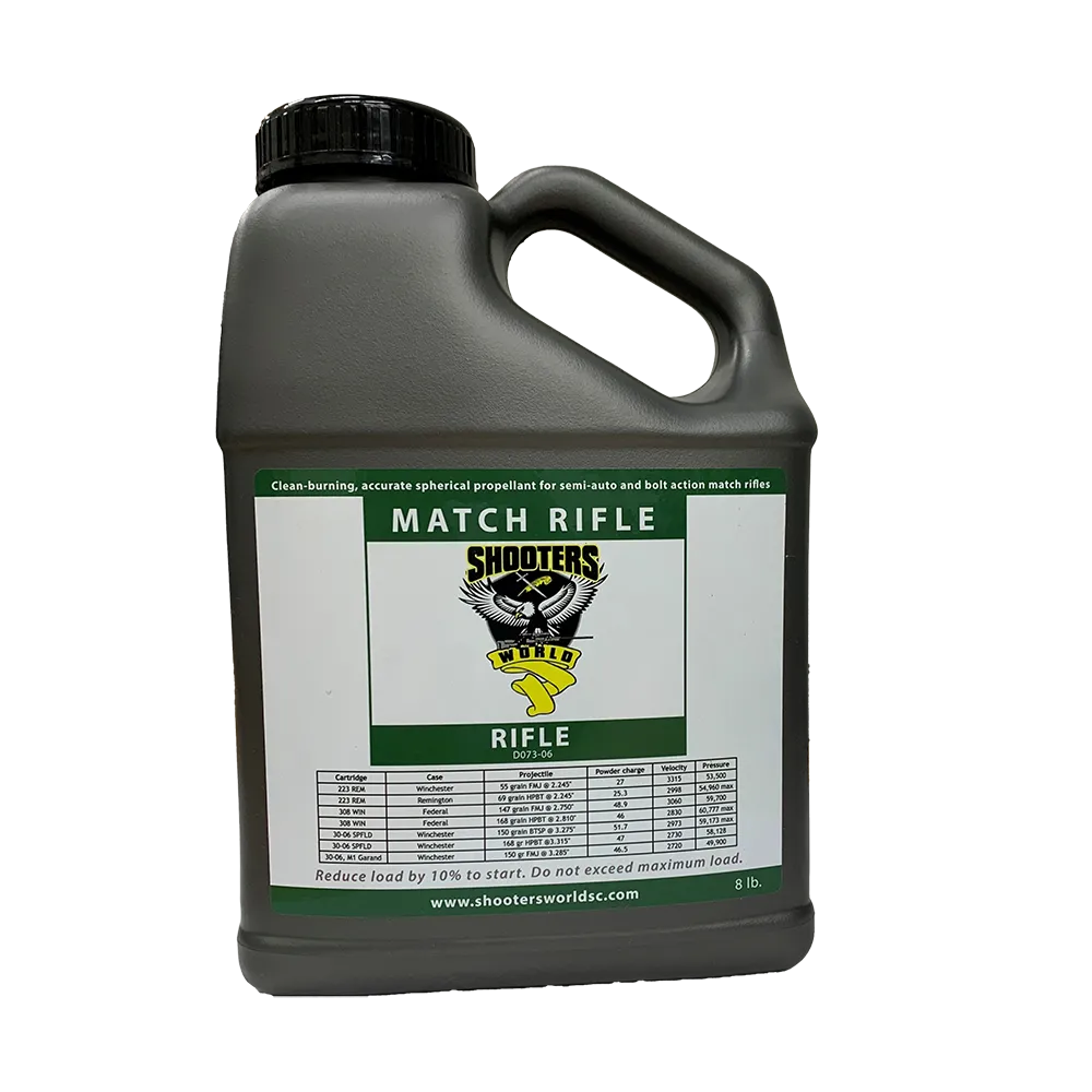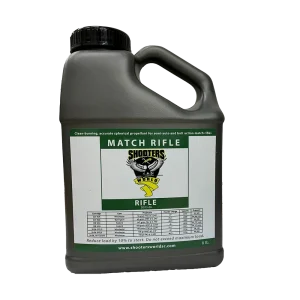 This propellant is highly versatile, and has shown exceptional accuracy in .223 Remington, 5.56mm, and .308 Winchester. It is similar in burn speed to Accurate® 2520, CFE™223, Reloader®15 and IMR 4064. It holds the broadest utility across all moderate rifle propellants. The propellant gas generation rate is appropriate for cartridges of the light to heavy sectional density .223 Remington and .308 Winchester. It can load the 55 grain, through 77 and 80 grain .223 REM. It loads the 150, 168 and 175 grain .308 Winchester, and loads all .30-30 combinations. It works in .30-06, in 7mm-08, 6mm BR, 6mm PPC, .204 Ruger, and similar cartridges. The burn rate and geometry of this powder yields low residue, and ample port pressure to cycle AR, M1, M1A, G3 and G36 systems. The flow characteristics of this propellant enable the loader to volumetrically dump charges within +/- 0.1 grains. It does contain a level of flash suppression, incorporated into the propellant. Match Rifle is a canister form of Explosia bulk and canister propellant D073-06.