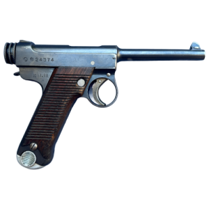 This immaculate condition example of a WW2 1936 Japanese Nambu Type 14 Semi Auto 8mm Pistol. This Nambu pistol has matching serial numbers on the following parts: receiver, barrel, cocking knob, trigger assembly, both wood grips, and bolt. The pistol comes with an original leather Hardshell holster, an original cleaning rod and spare magazine. The hardshell holster is in great shape with minor edge wear. These were there standard sidearm of the Japanese army throughout WW2. It is a unique pistol in the way that it works.