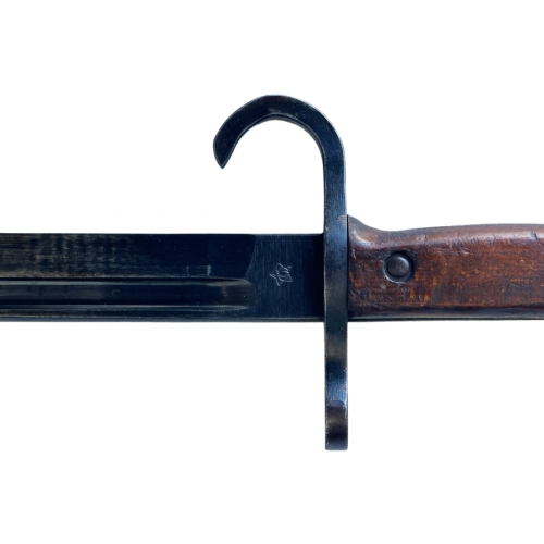 The Type 30 Arisaka bayonet featured a blade with a single edge and a fuller groove running along most of its length. The blade was approximately 15.75 inches (400mm) long. One distinctive feature of the Type 30 bayonet was its hooked quillon, which is a curved handguard that extends downward from the crossguard. This hooked quillon design was intended to catch an opponent’s weapon or equipment and disarm them in close combat. It could also be used as a wire cutter.
